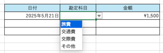 例えば、日付のセルには日付形式のみを入力可能に設定したり、勘定科目のセルには「旅費」や「交通費」、「交際費」といったプルダウンリストから選択するように設定したりできます。数値入力が必要なセルには、例えば、金額の上限を設定することで、誤った金額入力を防ぐことができます。