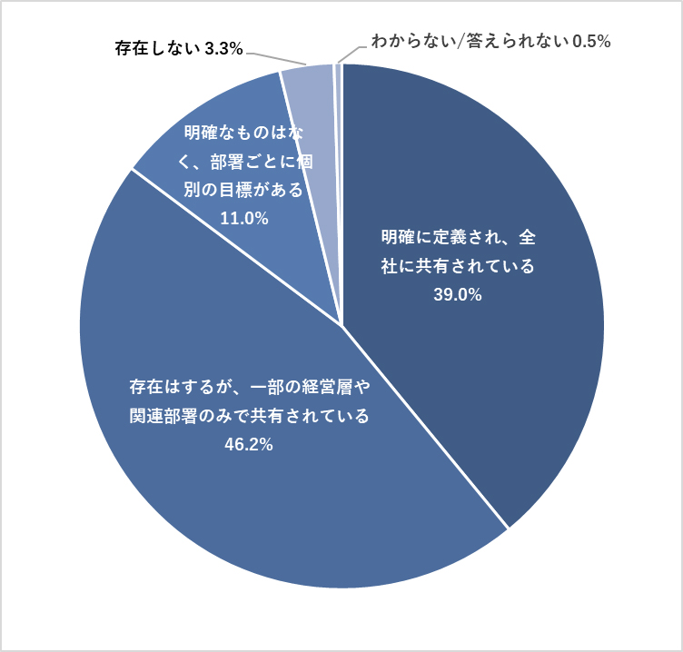 DXを推進している企業の中でも、ビジョンが「明確に定義され、全社に共有されている」のは39.0%に留まっています。最多の46.2%は「存在はするが、一部の経営層や関連部署のみで共有」と回答しており、DXの方向性を示すべきビジョンが組織全体に浸透していない状況が見られます。前設問で40.3%が「全社的に推進している」と回答したことと照らし合わせると、「ビジョンが全社共有されている」割合と近い数値になっています。これは、明確なビジョンの共有が、全社一丸となったDX推進の重要な要素であると考えられます。
